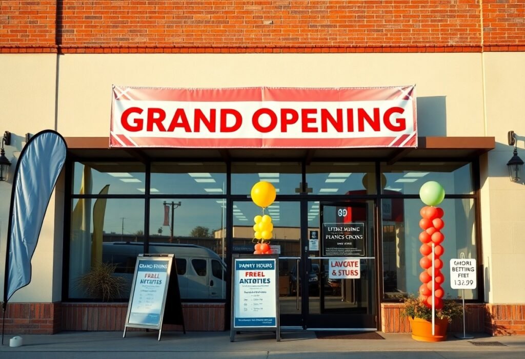 Signage choices for your grand opening range from vinyl banners and backdrops to A-frame sandwich boards, window decals, feather flags, coroplast yard signs, magnetic vehicle signs, temporary LED displays or inflatables; you should choose materials, placement, and legible design that suit your budget, permit rules, visibility and brand identity to attract foot traffic and communicate offers clearly.